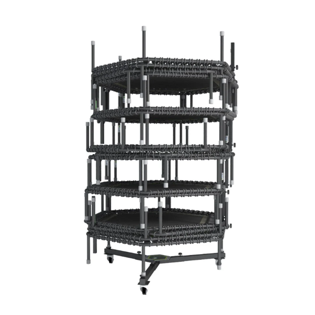 Ratastel alus kuni 16 batuudi hoiustamiseks. Ratastel süsteem võimaldab hoiustatavaid batuute mugavalt ühest kohast teise liigutada ilma, et peaksid neid ükshaaval tõstma hakkama.
